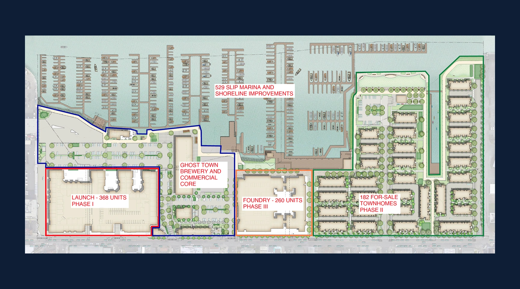 The project will also include 60 dry boat storage spaces which will be located along the waterfront. The 760 residential units are comprised of approximately 569 multifamily wrap units, 48 multifamily elevator stacked flats, and 143 multifamily townhouse units, with approximately 104 of these dwelling units offered as affordable housing units distributed throughout the site. The construction of the housing types will be done in a combination of on-grade wrap building, elevator building and row-home configurations. All residential buildings will be no taller than 65 feet, ranging from 3-to-5 stories.