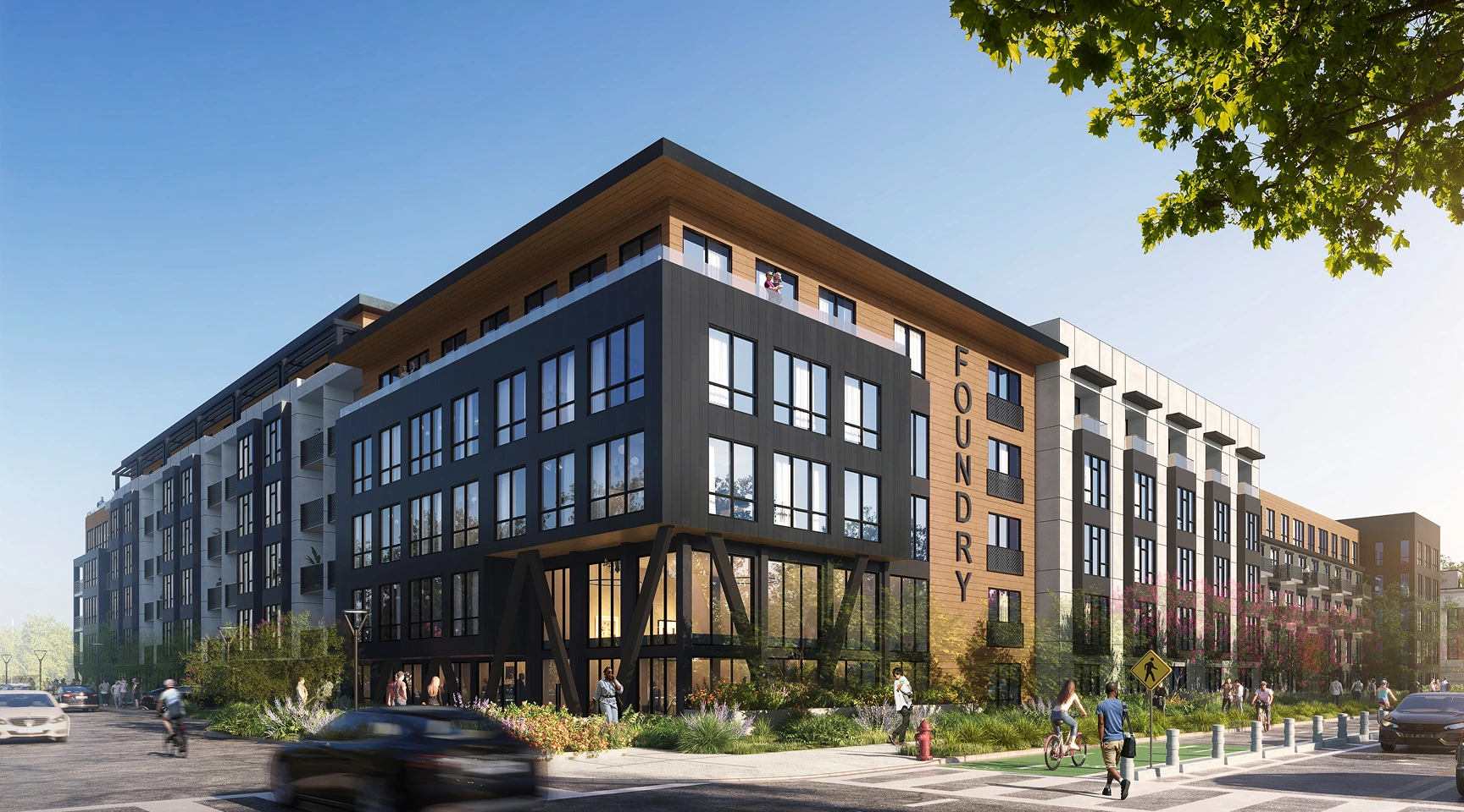 FOUNDRY will include one main large interior courtyards with pool, spa, dog runs, fire pits, and lounge seating. Other amenities fitness room, club room, and a large rooftop decks with BBQ and fire pits.